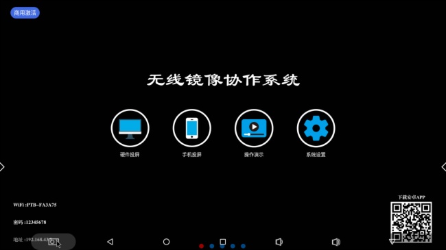 网络连接好之后,如果手机是第一次使用,需要先下载安装APP。具体方法为:手机扫描飞图盒主界面右下角二维码,下载APP并允许安装。APP的名称听起来挺牛逼,叫“投屏专家”。