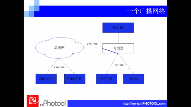 大部分高端手机都支持5G Wi-Fi频段,所以手机可以直接连接飞图盒5G Wi-Fi热点进行无线投屏。那么我们的2.4G手机投屏,则要想办法利用飞图盒的2.4G频段Wi-Fi进行投屏,具体网络结构见图1。